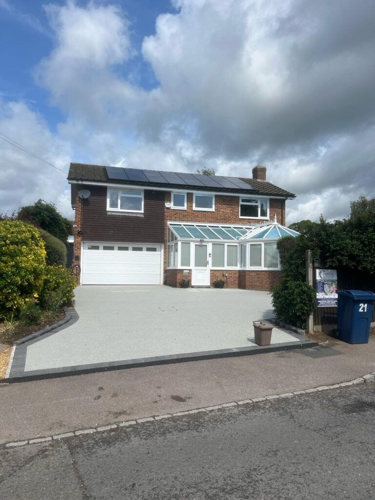 We completed the installation of a stunning new resin driveway in Chalfont St Peter, featuring a sleek charcoal border for a clean and modern finish. To enhance the design and functionality, we added a 5-inch charcoal key kerb along the flower beds, creating a seamless and polished look that perfectly complements the surrounding landscape. This project not only improved the property’s kerb appeal but also provided a durable and low-maintenance solution for the client.